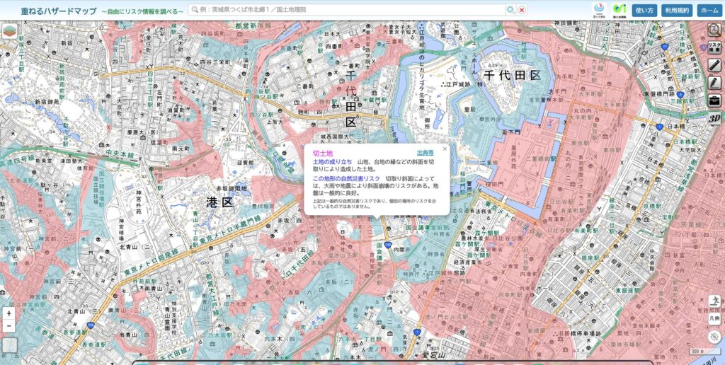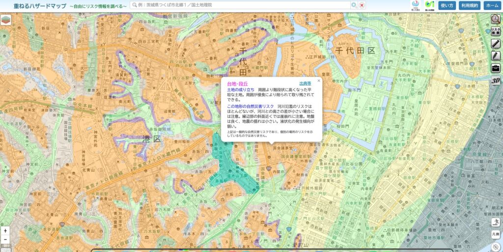 重ねるハザードマップでは土地の成り立ち、それぞれのリスクを確認することができます。