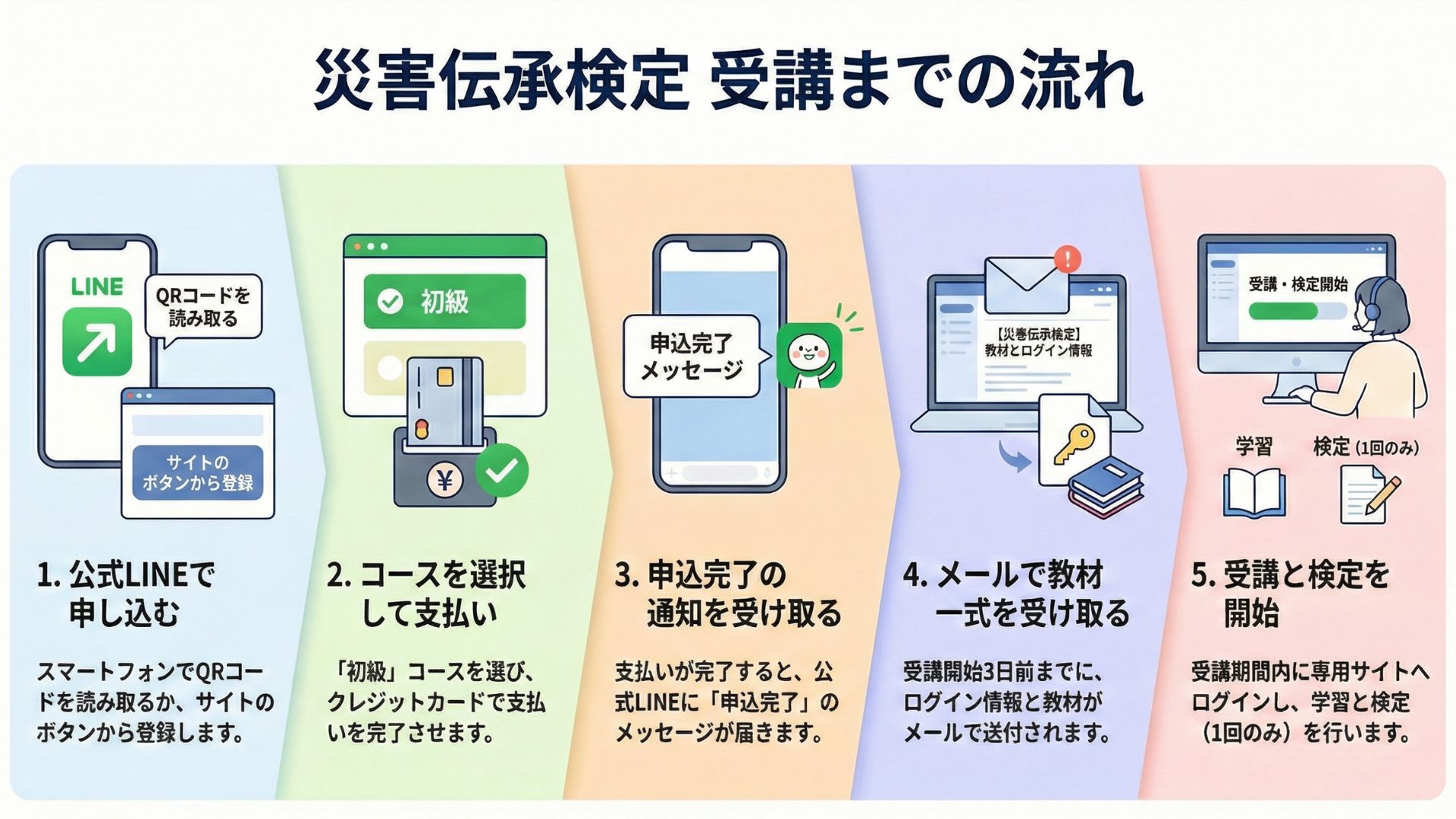 災害伝承検定の受講にかかわる、お申込、お支払い、事務局へのお問い合わせ、事務局からのご連絡など、受講申込から終了まで1つの窓口で済むためです。
