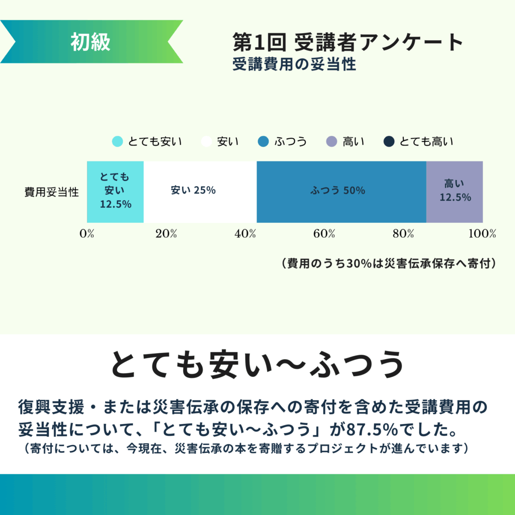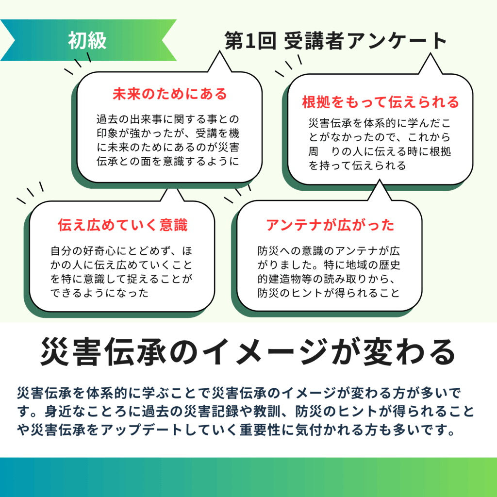 受講前は過去の出来事に関する事との印象がどうしても強かったですが、受講を機に未来のためにあるのが災害伝承という面を意識するようになりました。