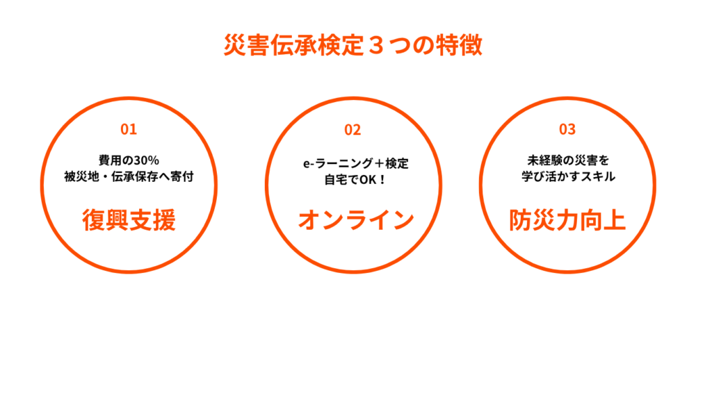 受講費用の利益30%が災害伝承の保存や復興支援へ寄付されます。自分自身が災害伝承を学び、防災への力を高めることが復興支援につながります。いま現在は、災害伝承について子どもたちに知ってもらうための書籍寄付プロジェクトが進行中です。学校や災害伝承施設、防災施設などへ災害伝承について学べる書籍(「災害伝承の大研究(PHP出版)」)を寄贈するものです。寄贈する際に、災害伝承検定で学び「災害伝承コミュニケーター」として活動されている方がプレゼンターと災害伝承を活用した防災講座を行います。