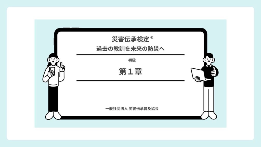 はい、テキストがございます。災害伝承検定は、e-ラーニングとリアルタイムのオンライン講座(Zoomミーティング利用)で、災害伝承について学習をしていただき、その習熟度を検定するものです。教材は、テキスト、スライド、動画教材をご用意しています。e-ラーニングシステム内に準備されています。