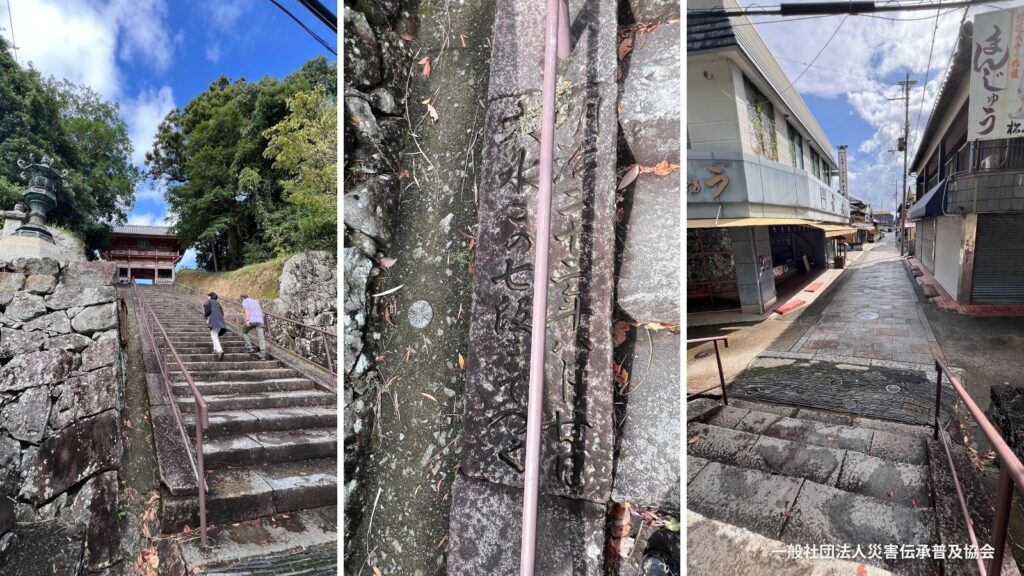 道成寺の石段の七段目に石板の自然災害伝承碑(写真中央)石段のすぐ前に門前町がある