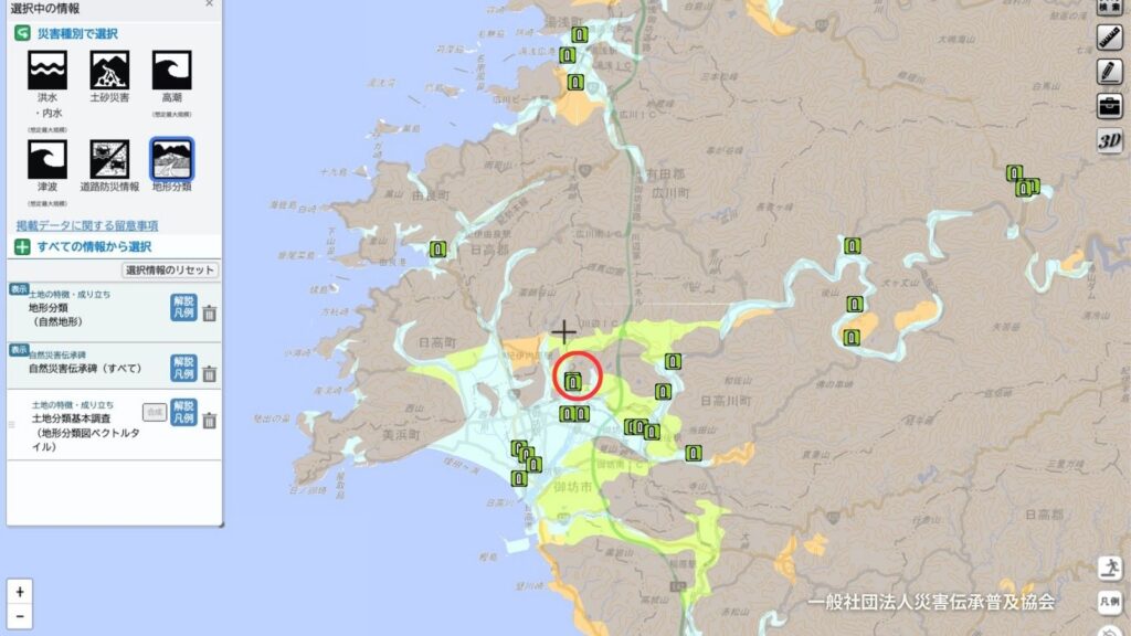 重ねるハザードマップの地形分類を表示させてみると、ほとんどの自然災害伝承碑が建立されている場所は水色の低地で、砂礫や泥が堆積してできた平坦地、または、その流れによってできた平坦地です。そして、この地形の自然災害リスクは、河川氾濫、高潮、液状化に注意、地震の時に揺れやすい、です。