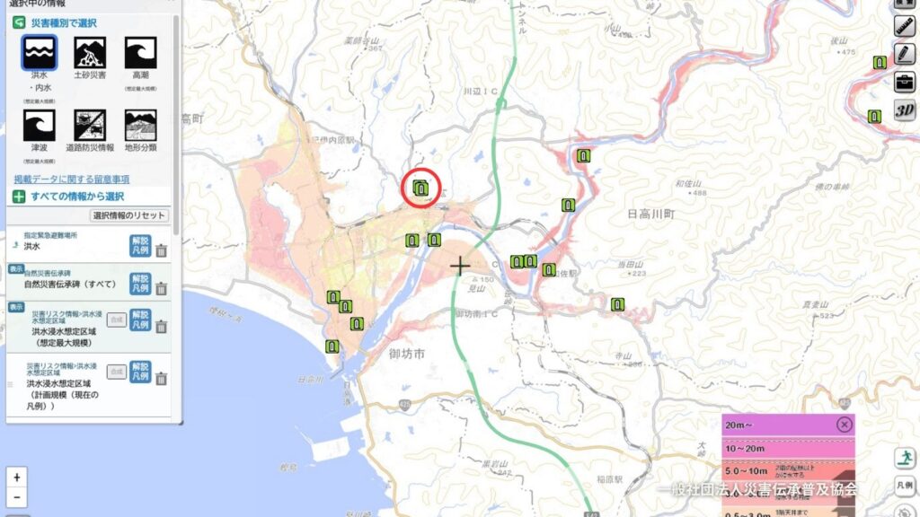 自然災害伝承碑の伝承内容を重ねるハザードマップや自治体のハザードマップで確認することで、その情報がいまの防災・減災に役立てることができます。いまもリスクがある場所だとわかれば、大雨のときは避難する、ということを石碑が思い出させてくれるトリガーになります。