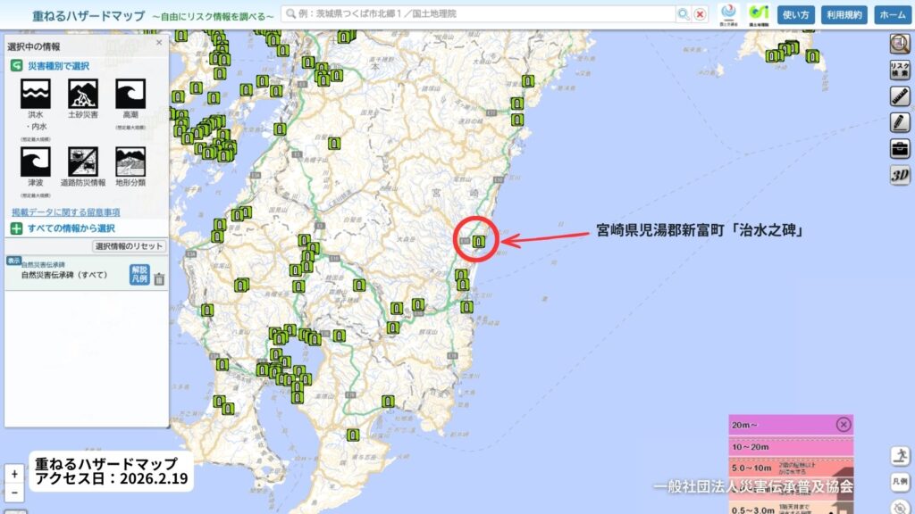 自然災害伝承碑めぐり旅では、雨降りの時は石碑へ行くことはせずに中止します。石碑があるところは過去に災害があった場所であり、そのリスクは今も持ち続けているところが多いからです。そのため重ねるハザードマップで必ずリスクについて事前確認しています。