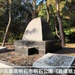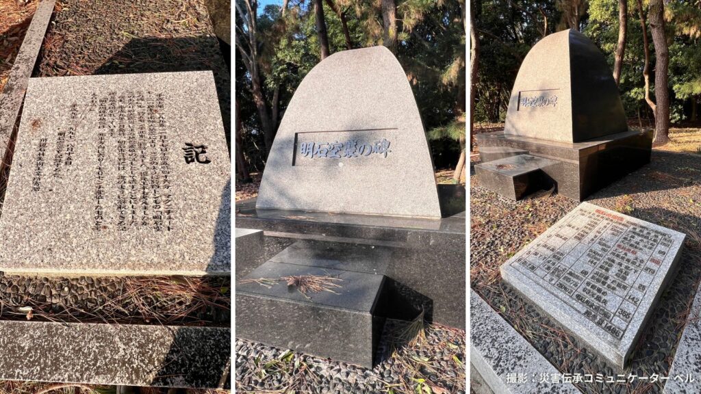 兵庫県明石市明石公園(兵庫県立図書館前)には、特徴的な石碑が設置されています。 この碑は、もともと「明石空襲」の慰霊のために建てられたものですが、その後の大地震によって動いてしまったという、二重の歴史を私たちに伝えてくれています。