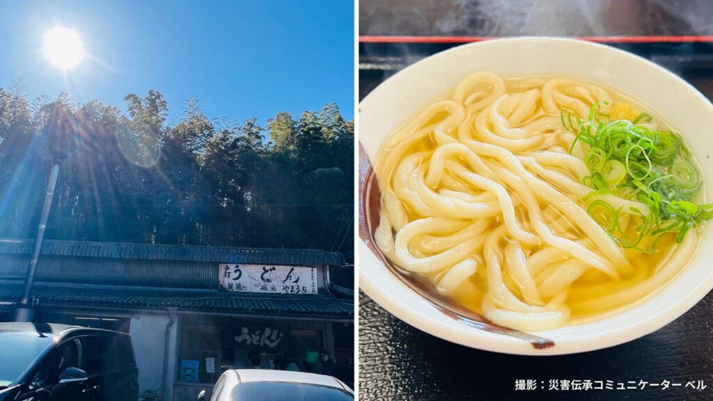 香川県での自然災害伝承碑めぐりの合間には、もちろん「うどん」をいただきました! 今回立ち寄ったのは「やまうち」さんです。煙突から煙がのぼる昔ながらの風情ある建物で、「製造 卸元」と書かれた手書きの看板が歴史を感じさせます。お天気も良く、お店の前にはたくさんの人が訪れて賑わっていました。 現地に行って、その土地の美味しいものをいただくのも、旅の醍醐味ですね😋