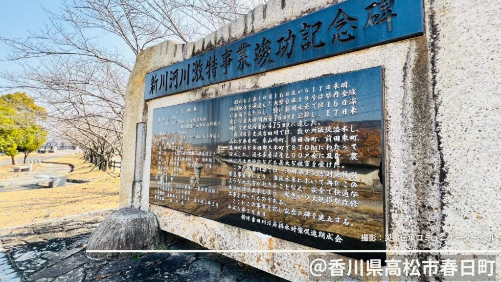 香川県高松市春日町に、どっしりとした石碑が建っています。 この碑は、大きな被害をもたらした台風の記憶と、二度と同じ災害が起きないようにと行われた大規模な河川改修事業の完了を記念して建てられたものです。
