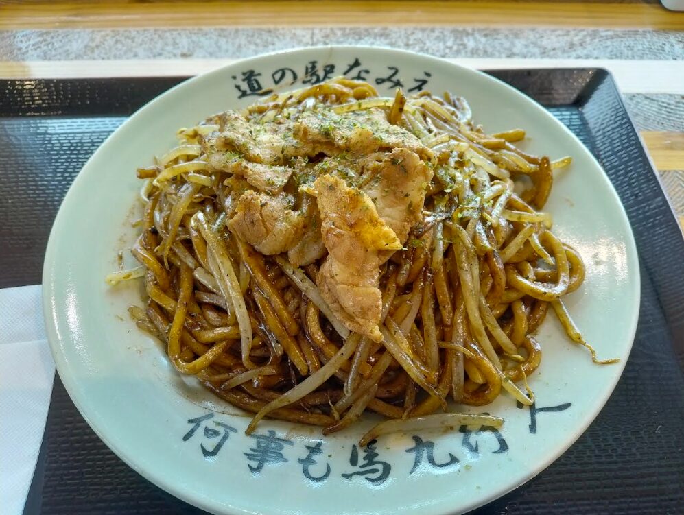 福島県の特産といえば喜多方ラーメン、新鮮な魚介類、モモなどの果物などいろいろありますが、私が押したいものの一つになみえ焼きそばがあります。なみえ焼きそばは普通の麺よりふと目でソースもこってり系。私はこのやきそば太麺&こってりソースの組み合わせが好きなんですよね~。今回は「道の駅なみえ」のなみえ焼そば。お皿に書いてある「何事も馬九行久」からもなんだか元気をいただきました(笑)。